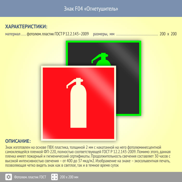 Знак F04 «Огнетушитель» (фотолюминесцентный пластик ГОСТ 34428-2018, 200х200 мм) в Волжском купить