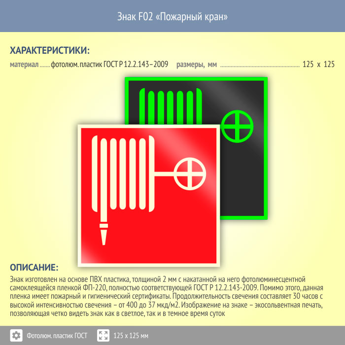 Знак F02 «Пожарный кран» (фотолюминесцентный пластик ГОСТ 34428-2018, 125х125 мм) в Волжском купить