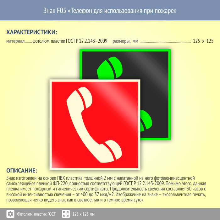 Знак F05 «Телефон для использования при пожаре (в том числе телефон прямой связи с пожарной охраной)» (фотолюминесцентный пластик ГОСТ 34428-2018, 125х125 мм) в Волжском купить