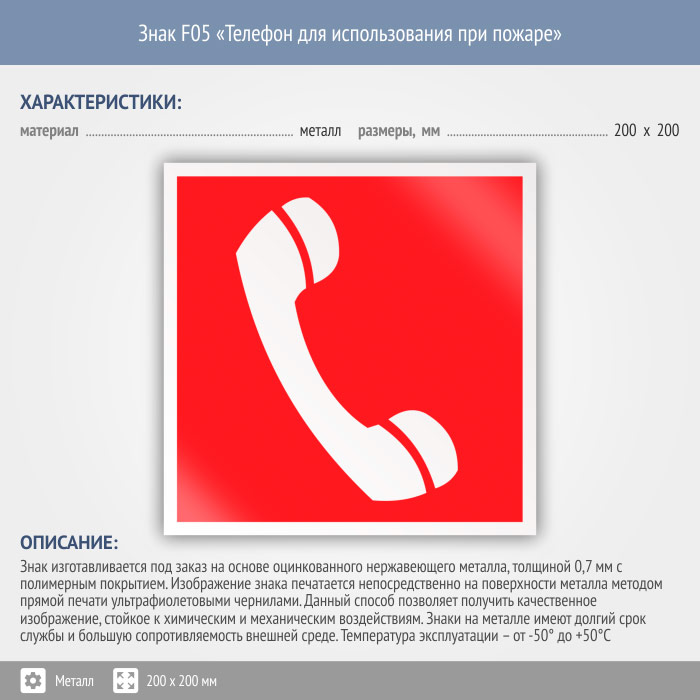 Знак F05 «Телефон для использования при пожаре (в том числе телефон прямой связи с пожарной охраной)» (металл, 200х200 мм) в Волжском купить
